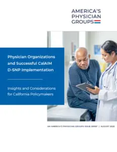 Twenty APG members, who serve more than 200,000 duals in California, shared their experiences in interviews conducted from September 2024 to January 2025. APG then developed three issue briefs based on the content of these interviews to help support the successful implementation of California’s aligned D-SNPs. Each focuses on a specific stakeholder audience: California policymakers, health plans, and medical providers. Although tailored to many of the circumstances in California, these briefs also hold lessons for physician groups, D-SNP plans, and Medicaid managed care organizations in other states as they work together to improve the care and outcomes of America’s duals population.
