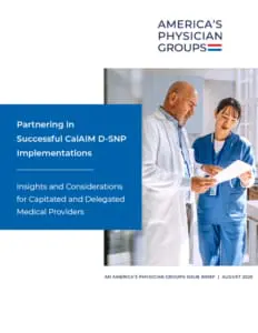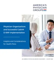 If implemented effectively, EAE D-SNPs have tremendous potential to ensure that duals receive highly integrated care that enhances their health outcomes and care experience. Opportunities also exist for engaging more physician groups to work in close partnerships with aligned D-SNPs. Many members of America’s Physician Groups are already in capitated and delegated relationships with D-SNP plans and have gained great insights into how to manage duals’ care effectively under these arrangements. (Capitation is a payment model in which physician groups or other health care providers receive a fixed, pre-set payment for each patient, such as from an MA health plan; delegation involves the plan assigning specific responsibilities or tasks to the medical group in tandem with the capitated payment, such as utilization management.)